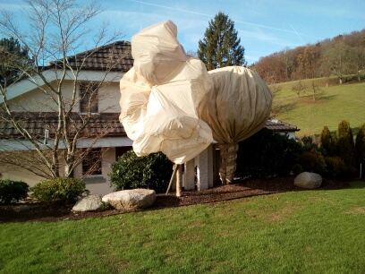 Manche Gehölze sind empfindlich auf Westwind. (Beispiele japanische Ahorne, Blumenhartriegel, Feigen u.a.), solche Pflanzen können mit Vlies oder einem Folienhaus geschützt werden.